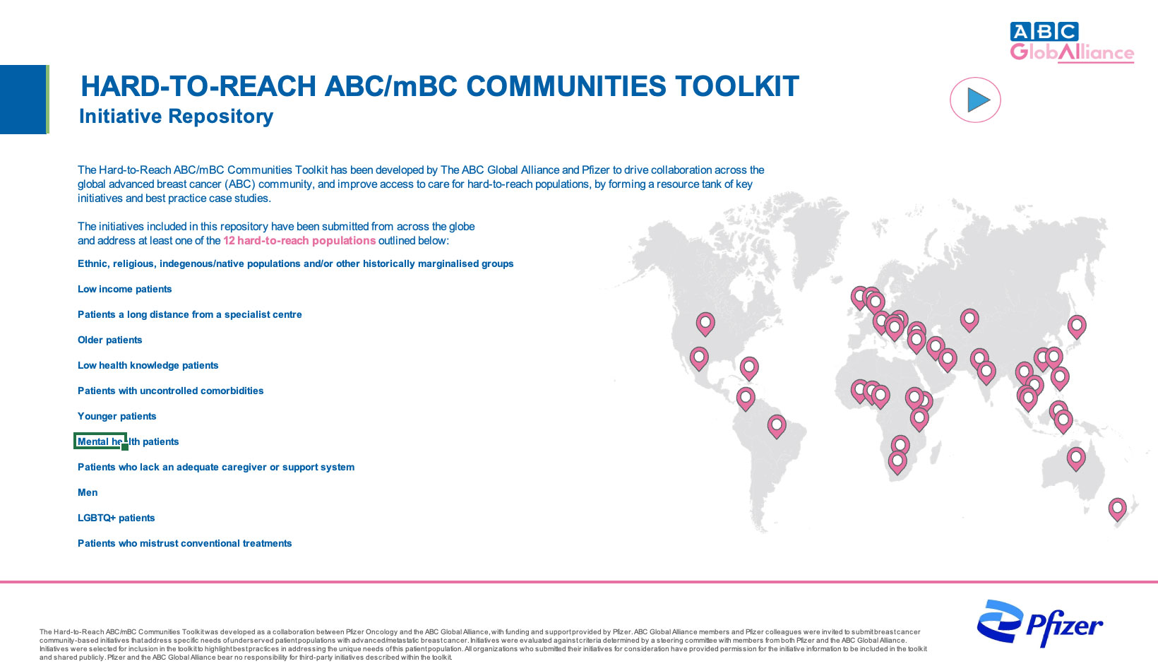To address the critical unmet need in access to care for hard-to-reach populations with advanced/metastatic breast cancer (ABC/MBC), the ABC Global Alliance and Pfizer have collaborated to develop a toolkit of relevant, community-based initiatives and best practice summary documents that aims to drive collaboration across the global ABC/MBC community.